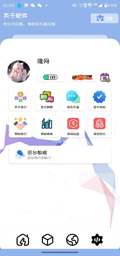 2、当天的天气情况显示在右上角。 3、在设置界面,既能看到共同使用隆网软件库的人数,还能与大家一同聊天。