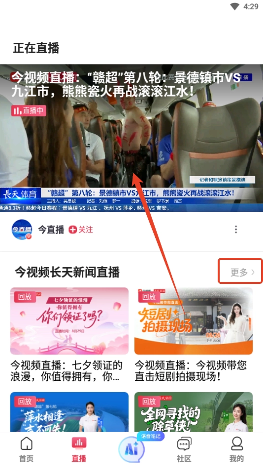 2、你既能够在页面上方直接挑选正在直播的节目,也可以点击【更多】选项。
