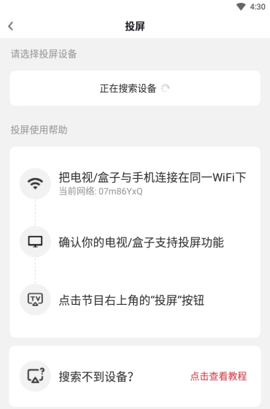5、请在搜索出的设备里,挑选需要投屏的设备(需提前确认电视/盒子和手机连接的是同一WiFi),要是您不清楚操作,可点击下方【点击查看教程】 。