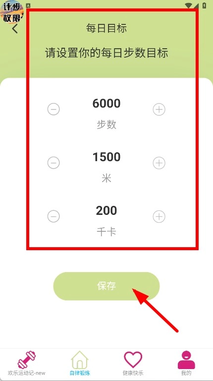 3、设置每日步数,距离,卡路里等目标,设置完成后点击保存,即可完成每日运动目标的设定。