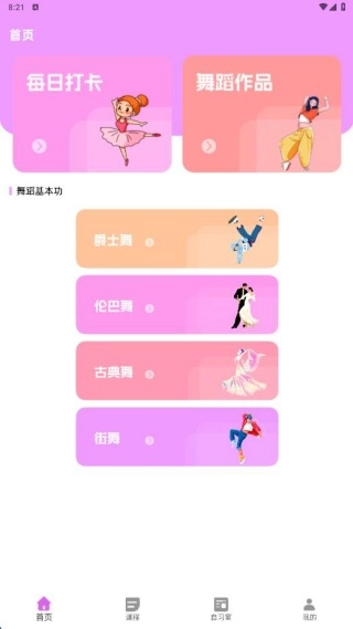 1、在首页提供了舞蹈基础功课程,涵盖绝世、伦巴等,轻松学习,还能每日打卡。