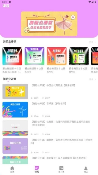 2、课程页面详细划分了舞蹈直播课和公开课的内容,方便我们选择。