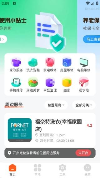 1、刚打开软件,就能看到十分全面的本地相关功能,无论是家政服务等日常生活服务,还是搬家等功能,都一应俱全。