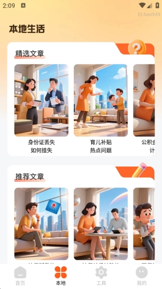 2、本地生活板块设有精选文章,能助力大家解决生活中遇到的棘手事,像身份证挂失方法、育儿补贴相关等热门内容。