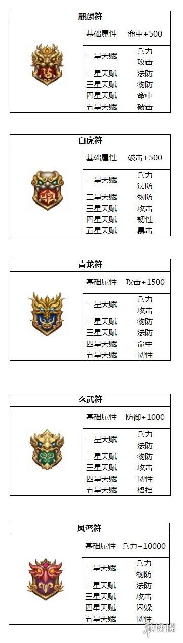 目前兵符共计10种,具体请参考相关图示。其中,橙色兵符与紫色、蓝色兵符在属性和培养空间上存在差异。
