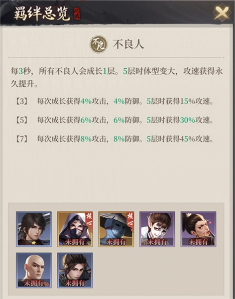 2、技能效果:战斗时间越长,全体不良人阵营角色的攻击、防御、攻速就会持续提升,同时体型增大。这些加成属性在本场战斗中始终有效。如此一来,不良人阵营的侠客便具备后期实现质变的潜力。一些原本并非定位为输出的不良人角色,在阵营效果的不断叠加下,也能打出令人惊叹的输出表现。