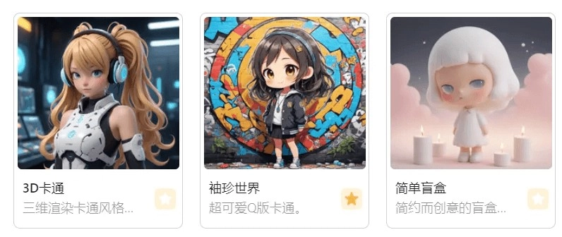 · 你还能选择进入高级创作,运用风格模型LoRA,像官方的{3D卡通}{袖珍世界}{简单盲盒}LoRA,它们都能助力你生成具有风格特色的盲盒呢!