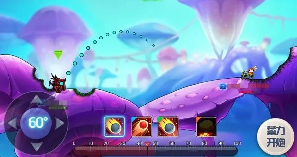 1. 进入游戏后,游戏界面转变为刻度蓄力模式。界面左边用于调整坦克的移动与射击角度,右边则是通过点击进行蓄力操作,玩家可依自身需求选择合适力度来射击。