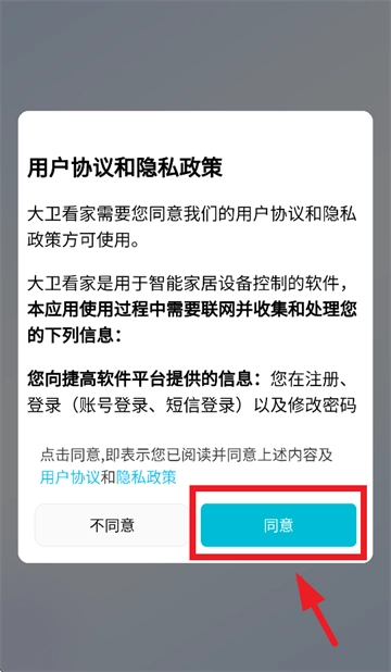 请下载、安装并打开大卫看家app,在操作开始时,需先同意用户协议以及隐私政策。