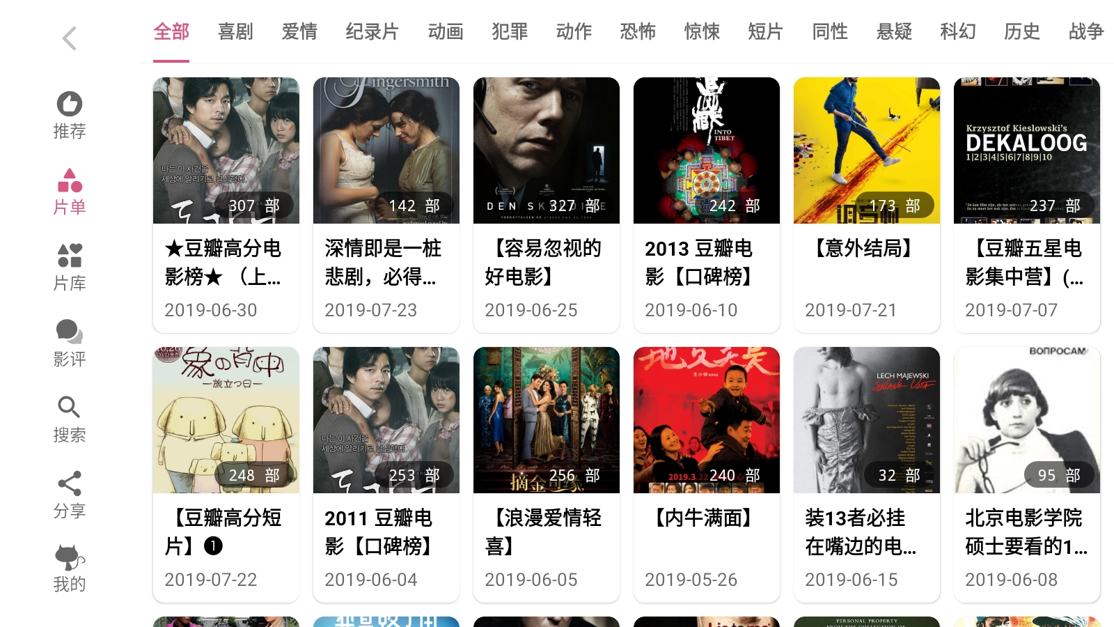 2. 轻点左侧导航栏中的片单,便能瞧见影视分类,其中涵盖喜剧、爱情、纪录片等。