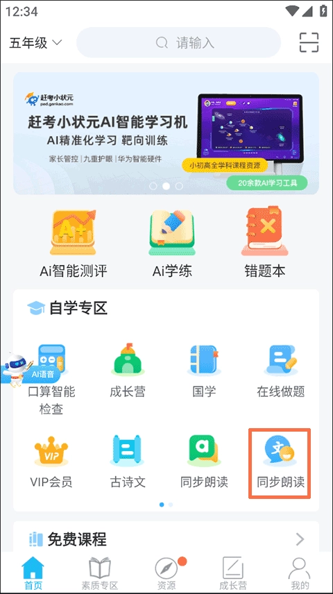 2、在自学专区当中,大家可以通过同步朗读来对学习进行近一步的巩固