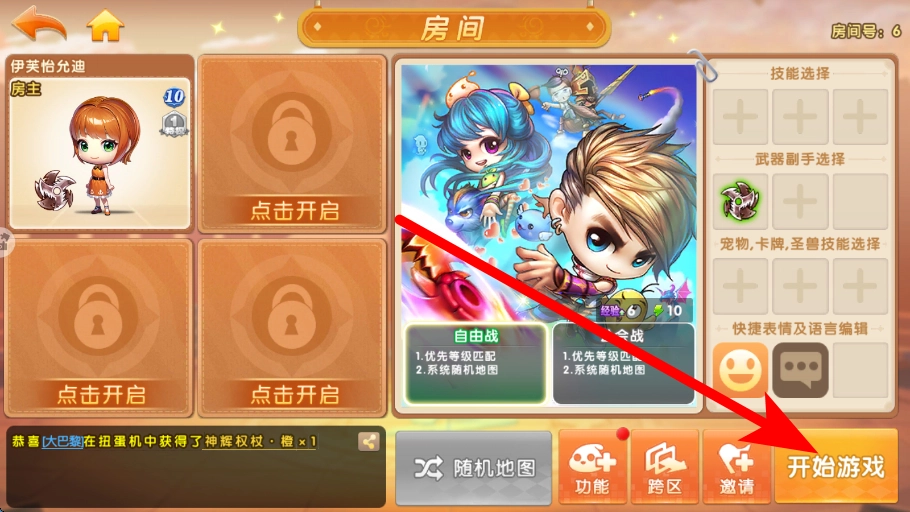 2、进入房间需在游戏界面,找到并进入房间,在房间中可进行技能、武器副手等选择,为接下来的竞技对战做好准备。