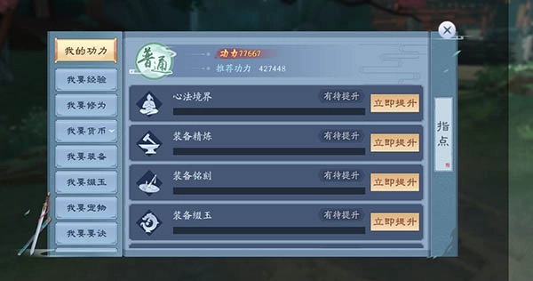 游戏内有丰富的功能可以使少侠变强,例如精炼装备、培养宠物、修炼技能等。除此之外,少侠若有任何成长方面的疑问,都可以点击上方“小风车”按钮,再点击“指点”,变强的方法都在里面了