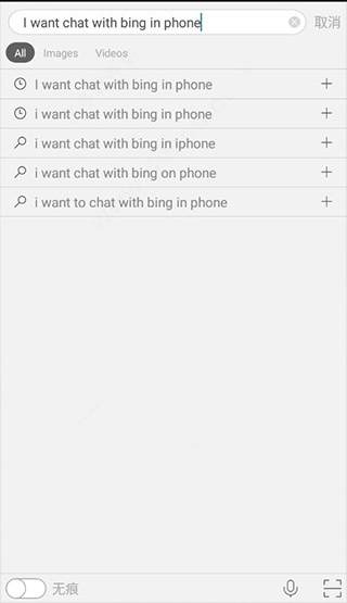 2、接着在搜索框内输入“ I want chat with bing in phone”,需留意,在手机上若输入其他文字,无法调出AI对话机器人,仅能开展简单的搜索。