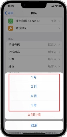 2. 可选择1月、3月、6月或一年。若在所选时间段内一次都未上线,电报系统将自动删除账号,其中涵盖聊天记录、个人信息等。