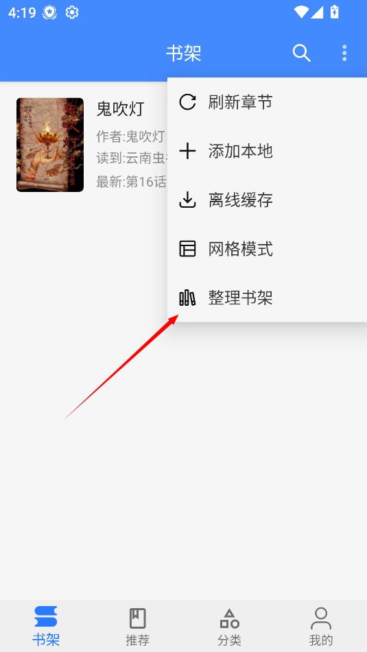 1、进入之后,点击右上方的三个小点,接着选择整理书架。