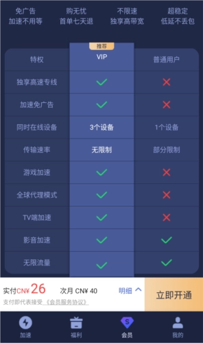 告别丢包,高清不卡顿,快速低延时,为用户提供良好的加速体验。