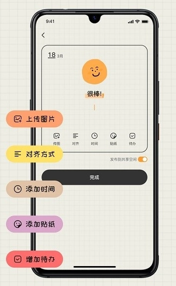 1.支持设置时间提醒功能,系统会在你设置的时间提醒你按时完成你的记录任务。