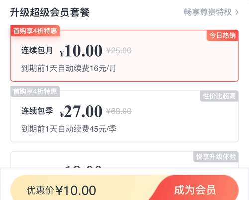 会员价格方面,连续包月为10元/月、27元/季、108元/年;非连续包月则是18元/月、50元/季、198元/年。显然,连续包月更为实惠,只是有时容易忘记取消。
