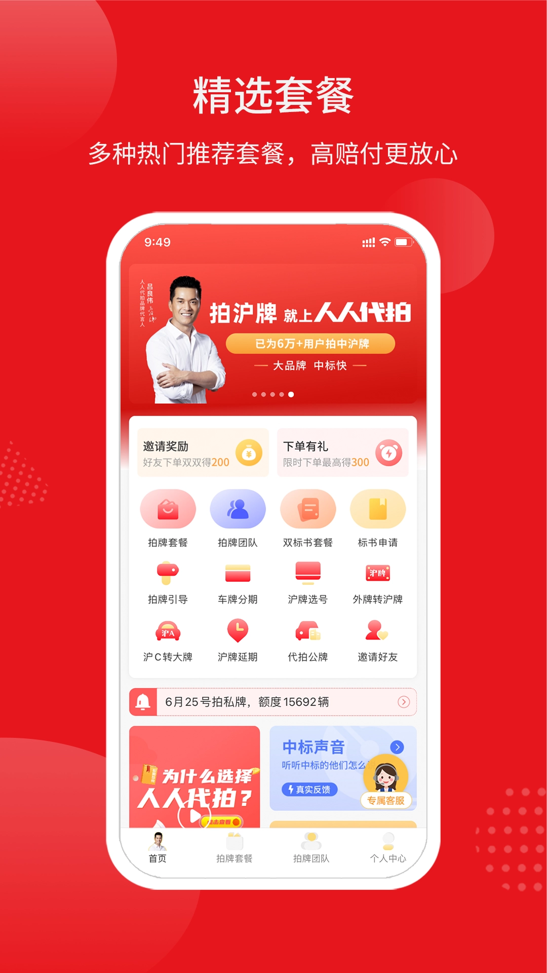 2、在人人代拍平台下单后,就可以等待车牌拍卖了。平台会依据车主的不同需求,推荐合适的代拍套餐。而且,有众多团队入驻该平台进行代拍服务。