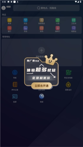 2、该应用首页有搜索栏,可搜地点、找路线,还展示附近的美食、药店等各类场所,以及常用地址添加功能,方便用户查找和管理地址。