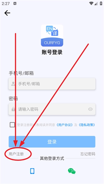 2.进入软件后,页面下方点击“注册”。