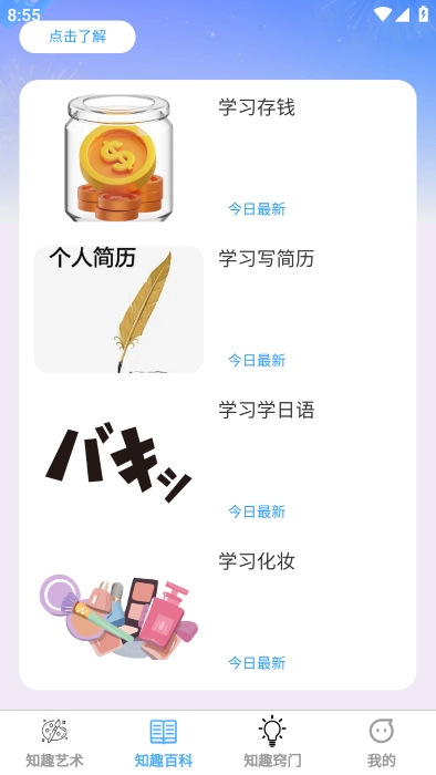 在知趣百科,你将发现各种有趣的知识学习内容,包括存钱技巧、日语学习、简历写作等等,让学习变得轻松有趣。