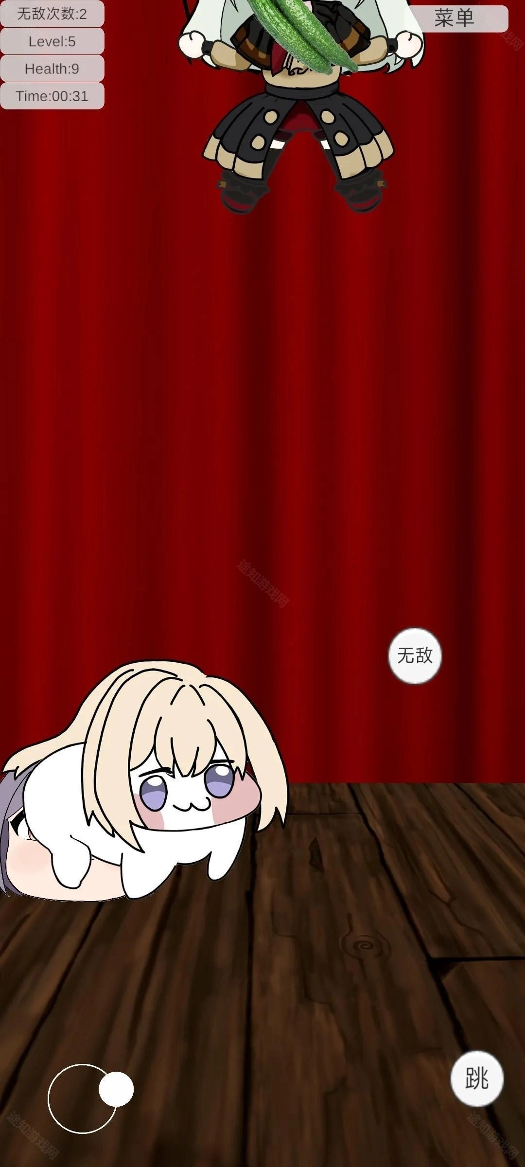2、左边轮盘移动角色,右边是跳跃和无敌键