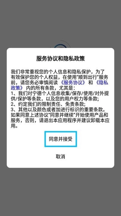 ·在2265安卓网打开顺到出行,阅读弹出的服务协议和隐私政策,点击【同意并接受】;