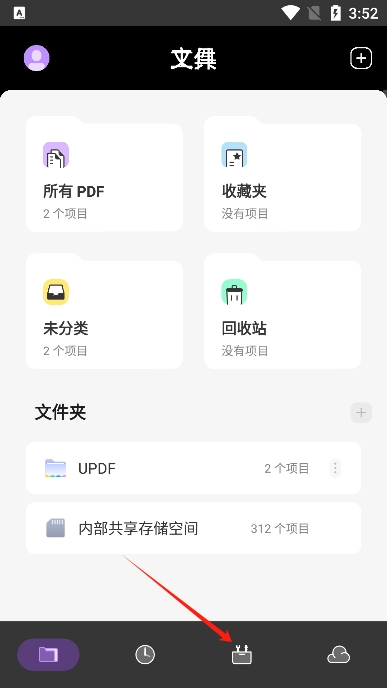 1、在本站免费获取该软件,打开后,用户能看到包含所有pdf、收藏夹、未分类以及回收站等在内的一系列文件夹,此时可选择“+”。