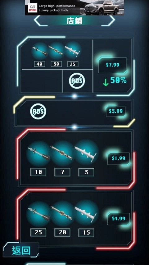 4、金币可以用来购买武器弹药,不同规格的导弹威力有所差异。