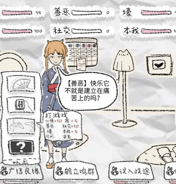 还有一个属性“社交”。 这个属性越高,化形,审美,壕都不受上述的能力的结局限制,并且各种形态的分支其实很大程度单纯看你的化形度。控制你的化形就能决定分支。(当然其他属性保持好自然就能走向好结局)化形超过50你就会往好方向走。