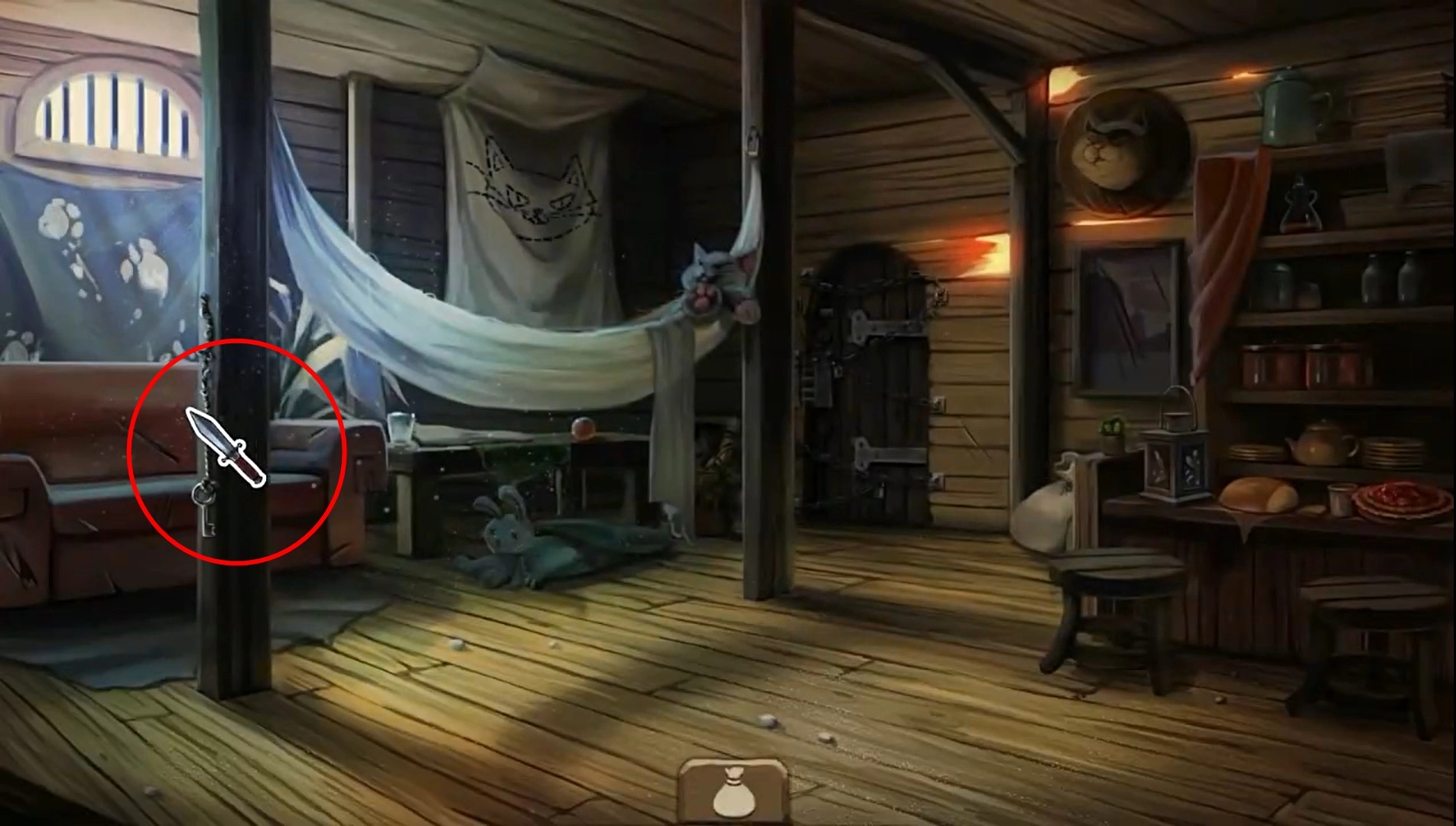 6、打开背包,将匕首拖至猫爪机关上使用,割断绳索后连续点击装置数次,触发铁门开启机制,成功脱离密室。