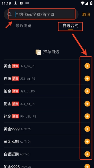 5.可通过搜索或是在“自选合约”推荐里找到需要的点击右侧+号进行添加