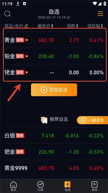 6.添加后返回自选页,可看到心仪的自选金价价格变化