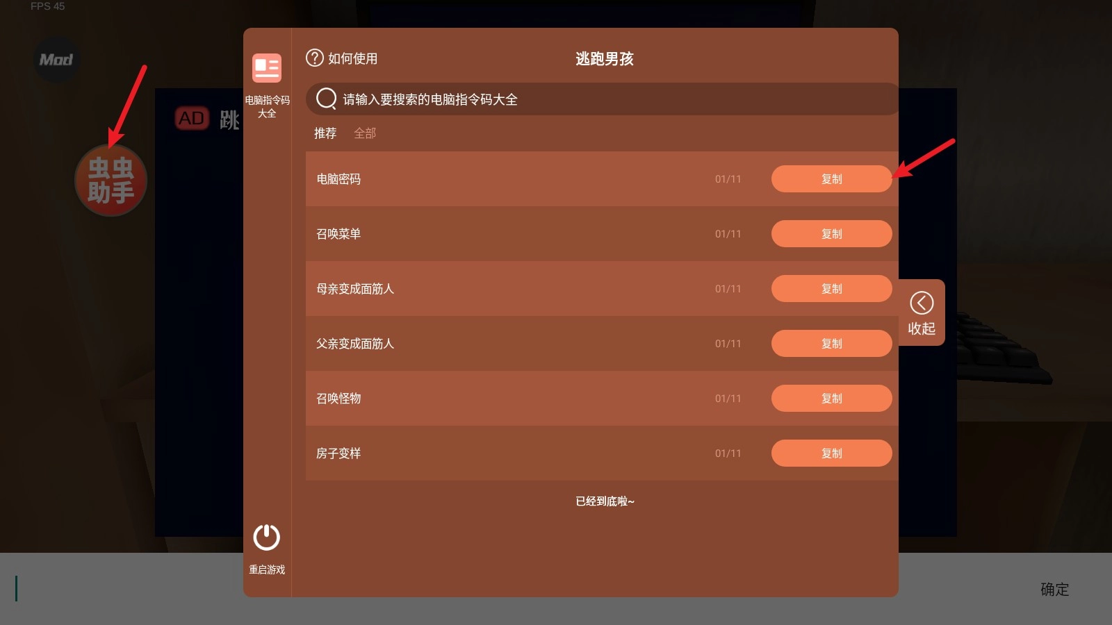 3、如果嫌输入太麻烦,或者不想切换复制的话,可以直接点击左侧的虫虫助手,在这里的每个代码都能直接复制。