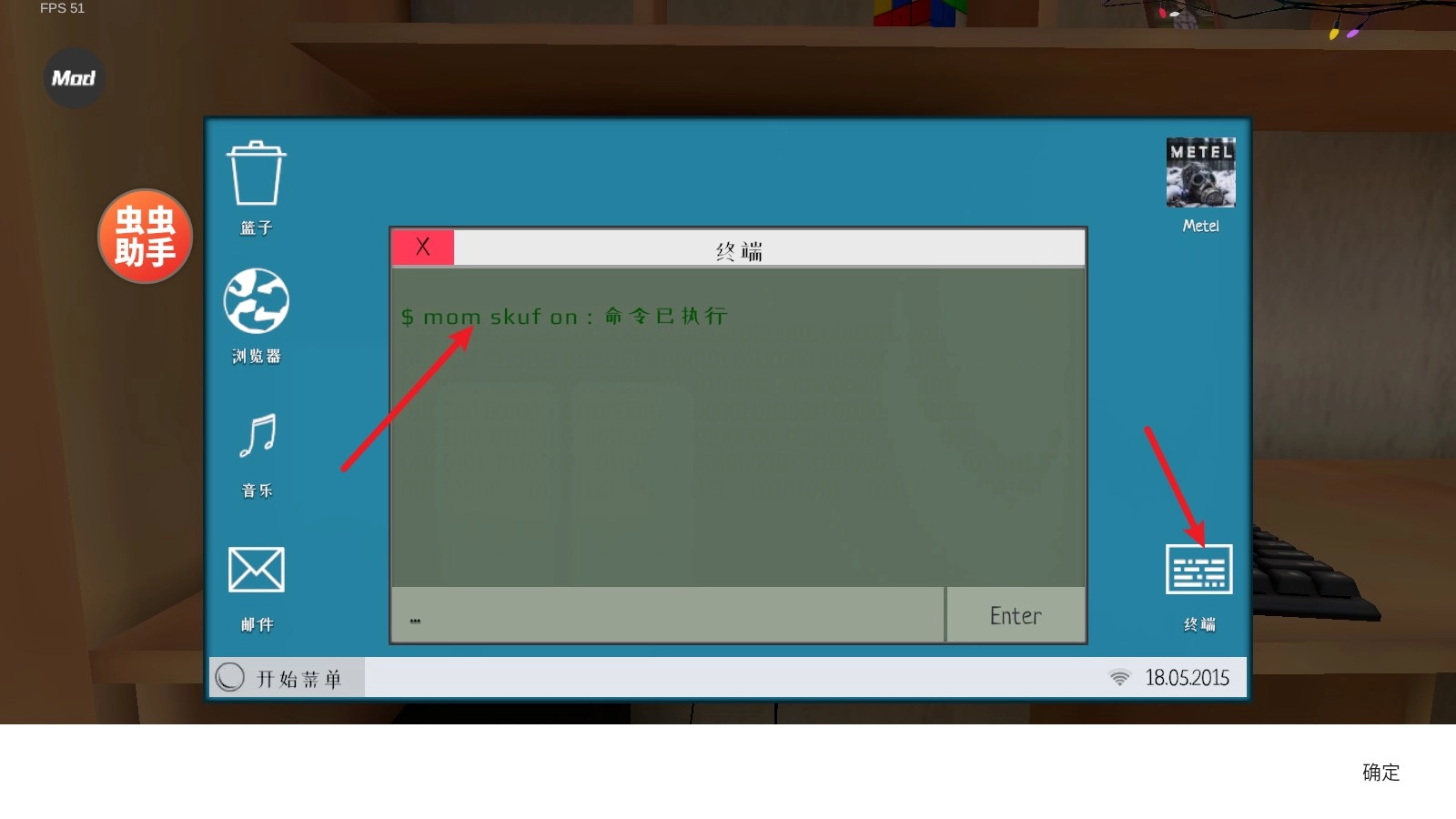 4、接着点击右下角的终端,在输入框中输入代码就能执行,如这里让妈妈变成面筋人的代码就执行了。