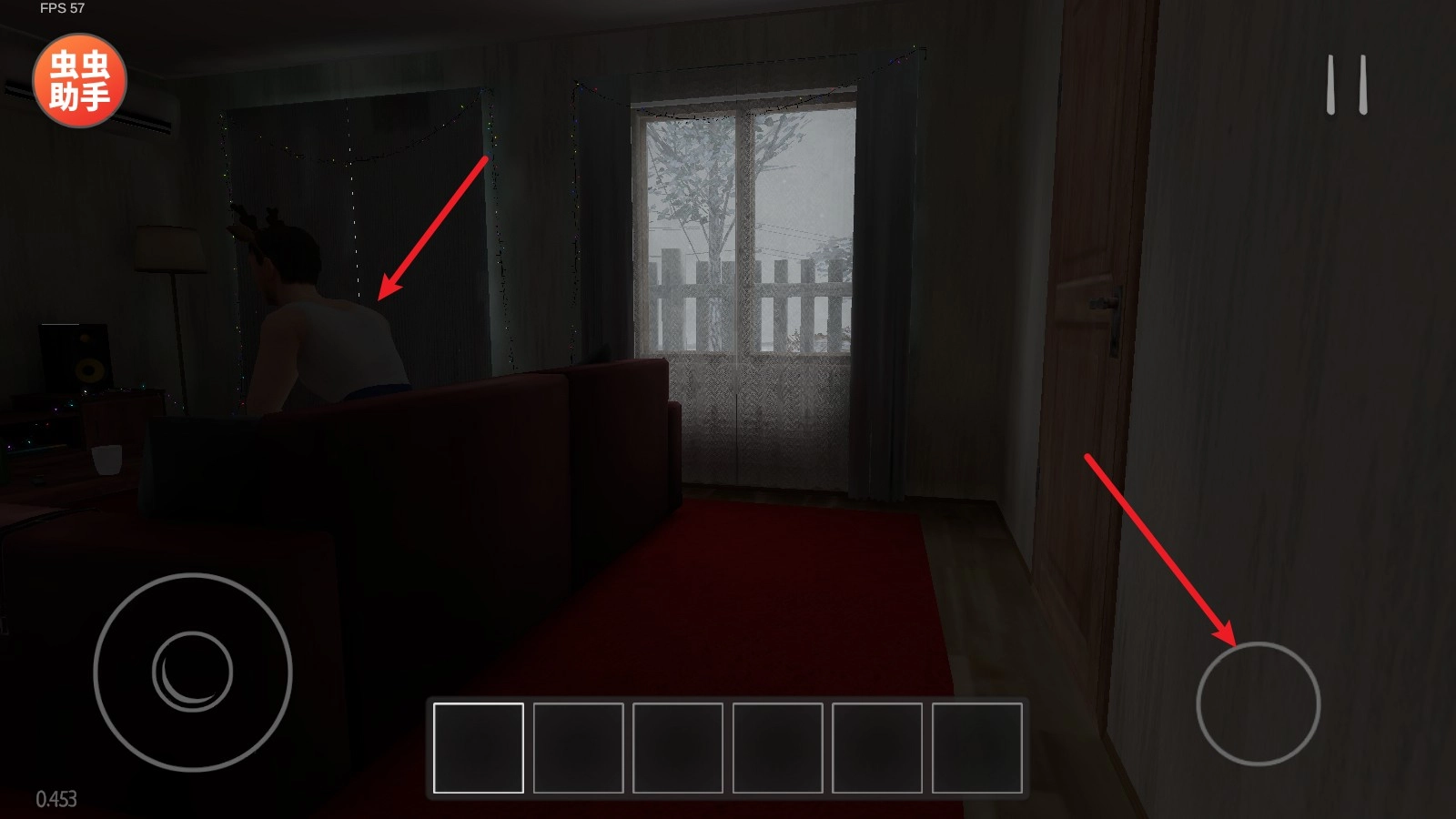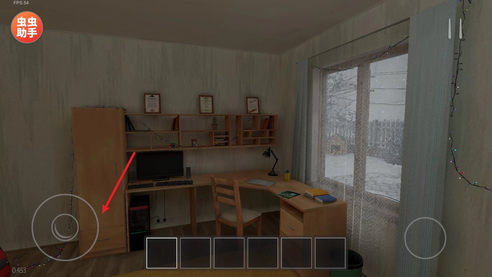 1、游戏中我们的目的是要逃出家门,首先了解一下操作,左侧的摇杆可以控制移动,拖动屏幕就能转换视角了。