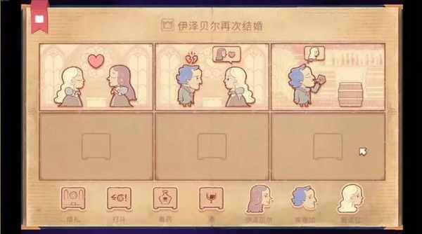 4、玩家先将婚礼放入第二个框框中,再将张友志和陈小梅放入第二个框框中,他们会心碎,如图所示。