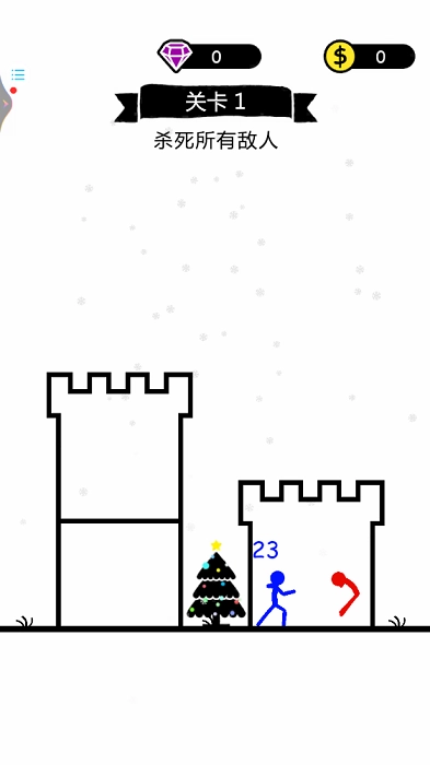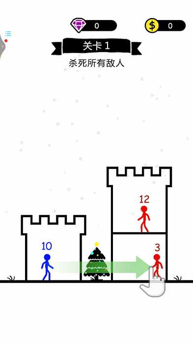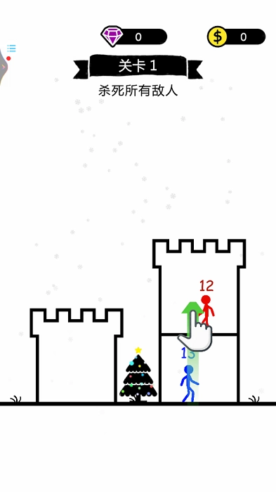 关卡1,杀死所有敌人,操控屏幕前的蓝色火柴人向右侧滑动,如图所示,绿色箭头所指方向。