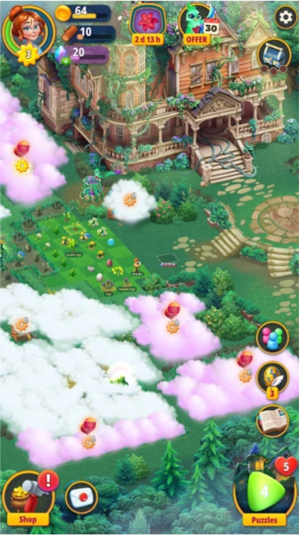 2、游戏开始时,你仅拥有自家门前的小花田,随着解开迷雾,更多的土地将逐渐揭开。你可以根据喜好选择装饰风格,无论是古典雅致,还是简约风格,游戏都能满足你对美丽花园的所有设想。