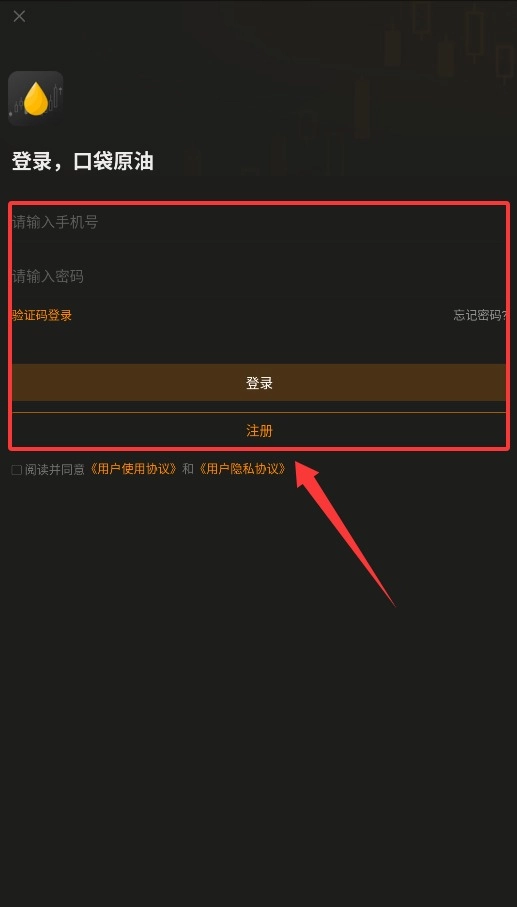 1. 初次打开口袋原油时,会呈现隐私政策与用户协议,认真阅读完毕后,点击底部的“同意并使用”按钮,即可进入软件。