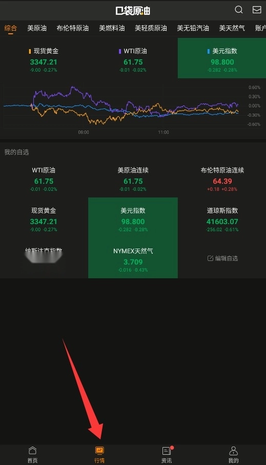 3、成功登录后进入主界面,点击"行情"选项即可查看实时原油价格走势和详细市场数据。