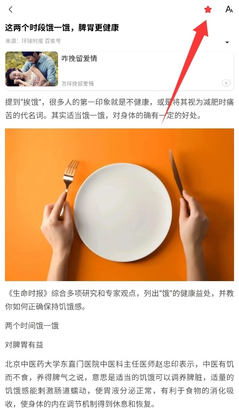 2、点击进入想保存的报道详情页,找到右上角五角星图标并轻触,系统会提示"收藏成功"。