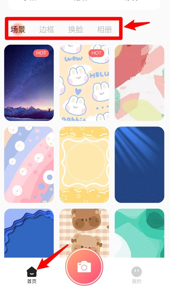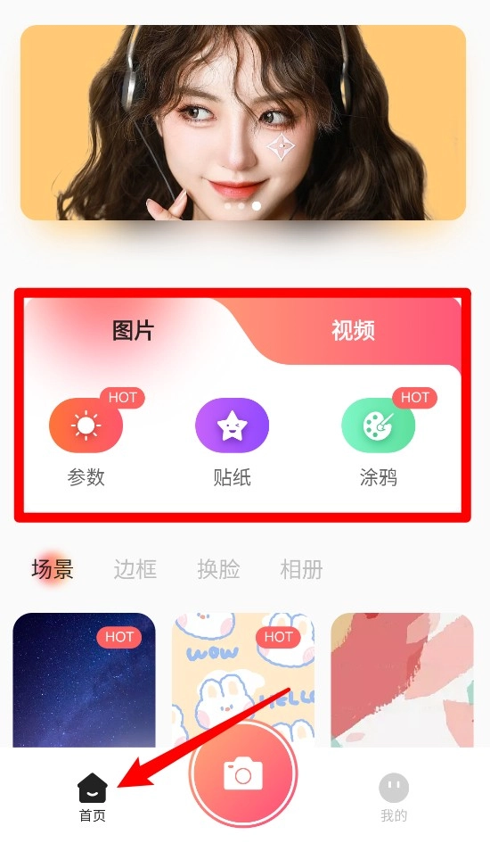 1、点击首页底部“首页”图标,进入图片编辑主页,选择参数、贴纸或涂鸦功能。