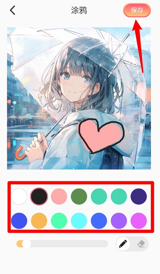 3、切换至“涂鸦”功能后,选择下方颜色进行绘图,完成后点击右上角“保存”。