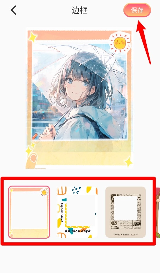 4、进入“边框”功能,挑选心仪的相框样式,预览效果无误后,点击右上角的保存按钮。