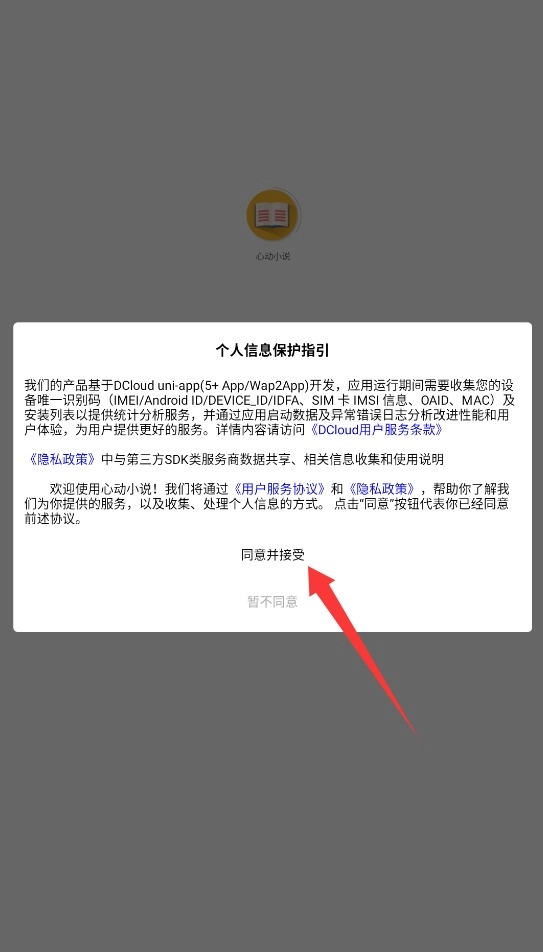 1. 开启心动小说,首先查看首页的协议内容,若认为没有问题,便点击同意,进而进入主页面。