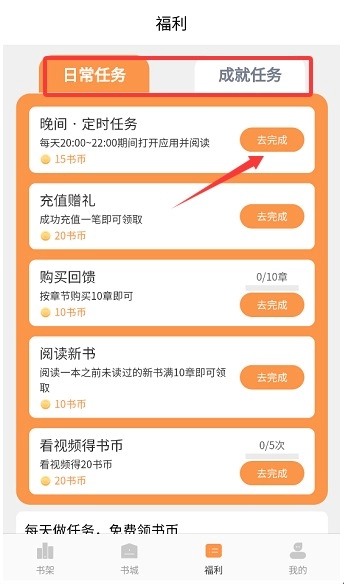 3、在福利中心做日常任务,完成阅读任务能赚更多书币,攒够了就能继续免费看小说。