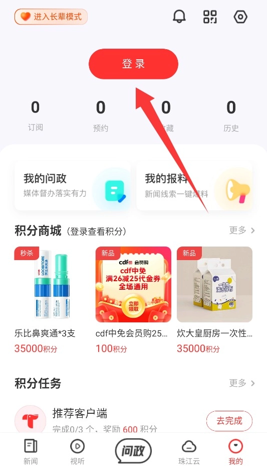 1. 初次打开触电新闻,点击右下角“我的”,进入个人中心,选择上方的登录按钮,完成账号注册或登录操作。